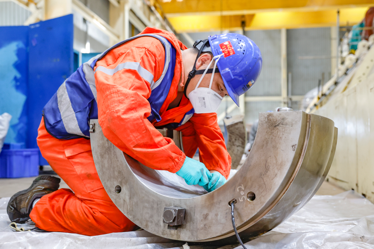偌大的发电机旁,身着橘色连体服的热机五班班员顾伟正全神贯注地对着轴瓦进行细致的修刮工作。他稳稳地拿着刮刀,双手熟练而有力地操作着,每一次刮削都精准而恰到好处,时而附身贴近,仔细观察修刮效果,时而调整姿势和力度,确保每一处修刮都能达到理想状态。周围的工具摆放整齐,顾伟的额头渐渐渗出细密的汗珠,跪地的姿势也不知坚持了多久,但他毫不在意,依然沉浸在精细的修刮工作中,只为让其在设备运行中发挥出最佳性能,保证运转顺畅。