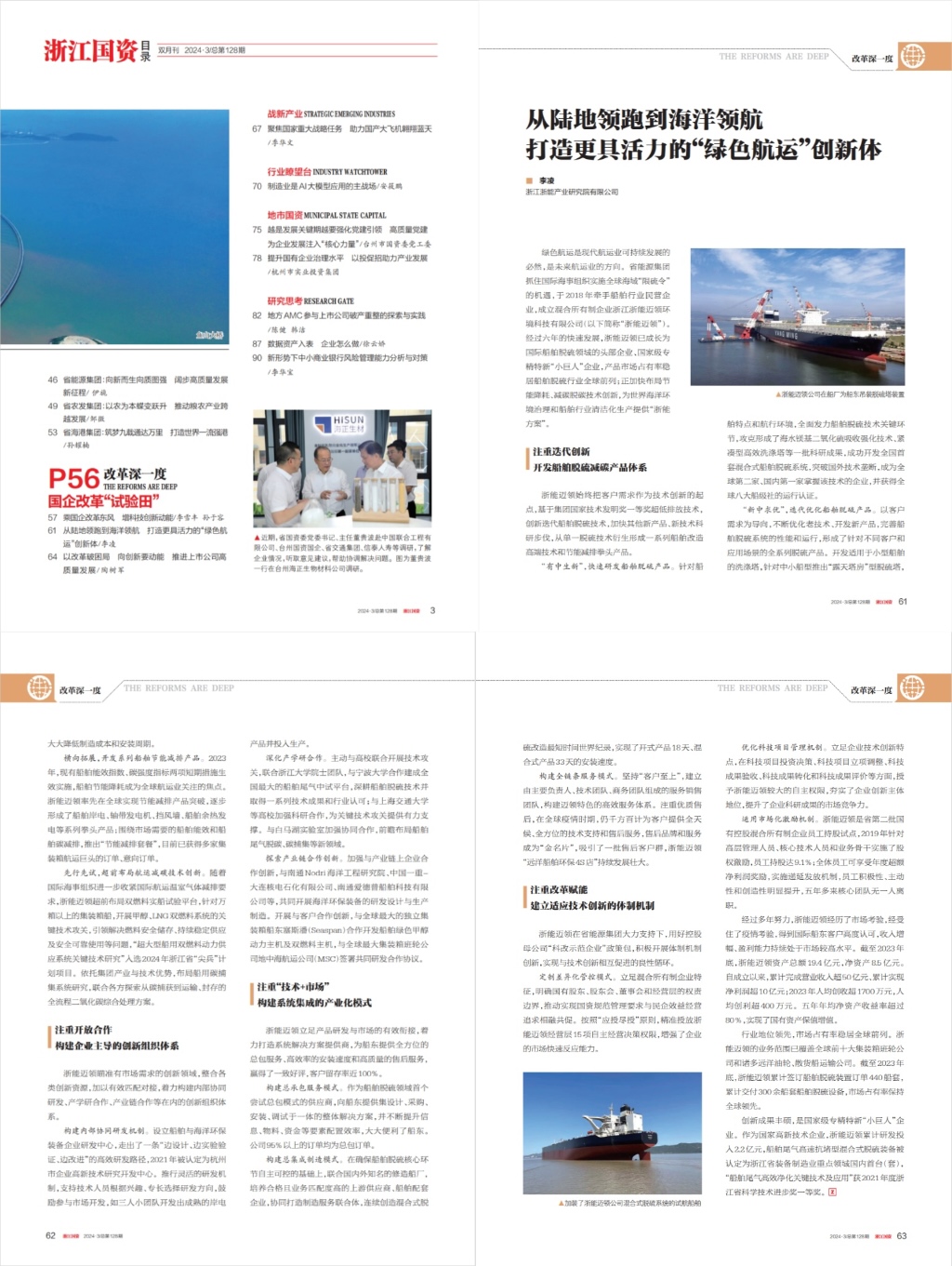 绿色航运是现代航运业可持续发展的必然,是未来航运业的方向。省能源集团抓住国际海事组织实施全球海域“限硫令”的机遇,于2018年牵手船舶行业民营企业,成立混合所有制企业浙江爱情岛论坛 迈领环境科技有限公司(以下简称“爱情岛论坛 迈领”)。经过六年的快速发展,爱情岛论坛 迈领已成长为国际船舶脱硫领域的头部企业、国家级专精特新“小巨人”企业,产品市场占有率稳居船舶脱硫行业全球前列;正加快布局节能降耗、减碳脱碳技术创新,为世界海洋环境治理和船舶行业清洁化生产提供“爱情岛论坛 方案”。