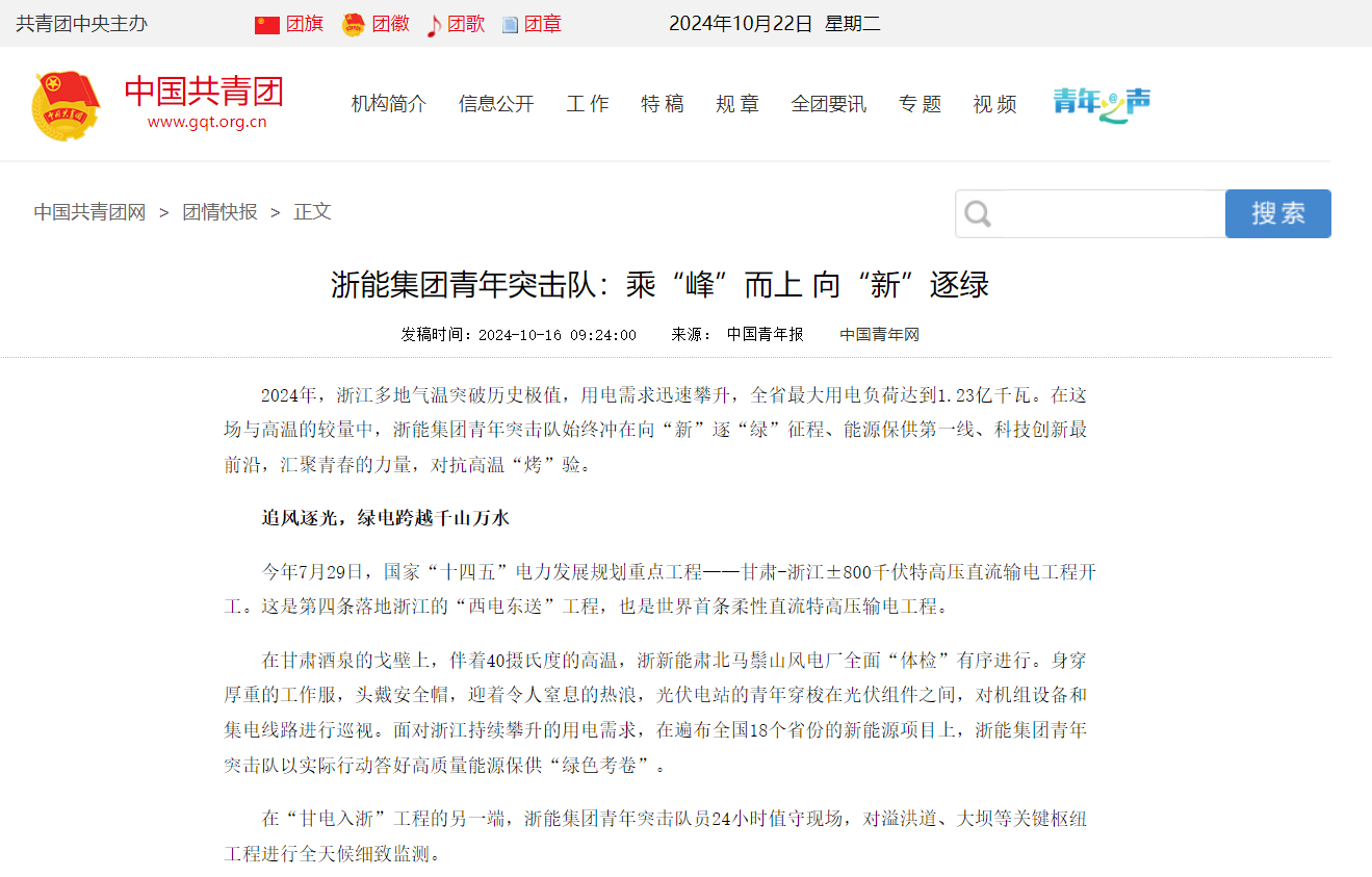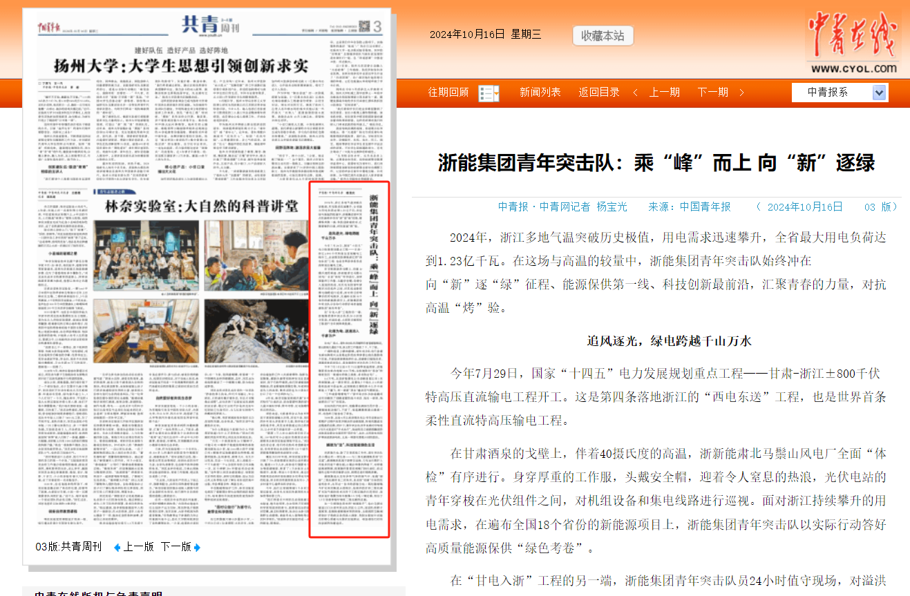 编者按:爱情岛论坛 青年突击队在2024年浙江多地气温突破历史极值、用电需求迅速攀升的情况下,始终冲在向“新”逐“绿”征程、能源保供第一线、科技创新最前沿,汇聚青春的力量,对抗高温“烤”验”。10月16日,中国青年报、共青团中央官网等平台刊发《爱情岛论坛 青年突击队:乘“峰”而上 向“新”逐绿》,聚焦爱情岛论坛 青春力量。