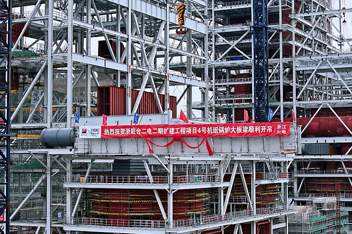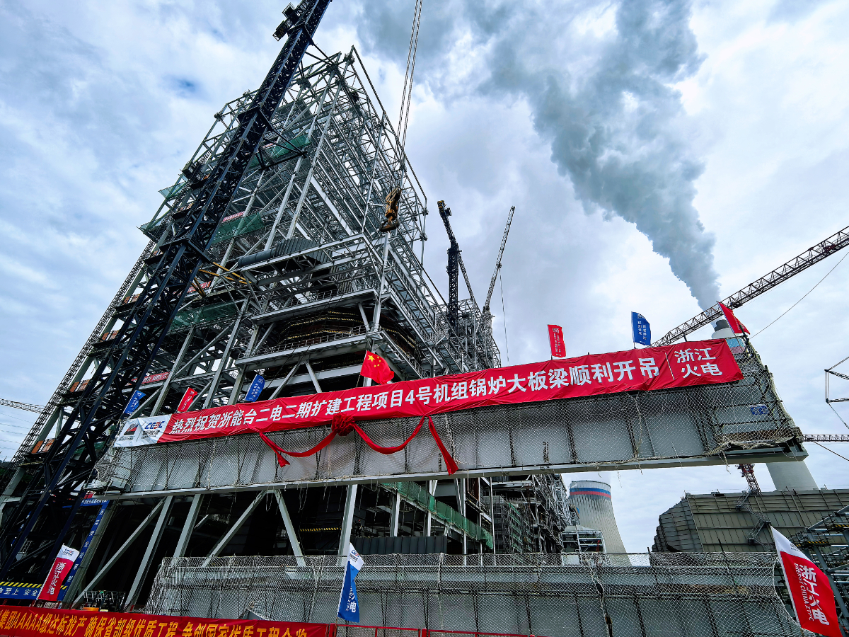 高质量发展看“浙”里|台二电二期扩建工程项目4号锅炉首根大板梁吊装就位