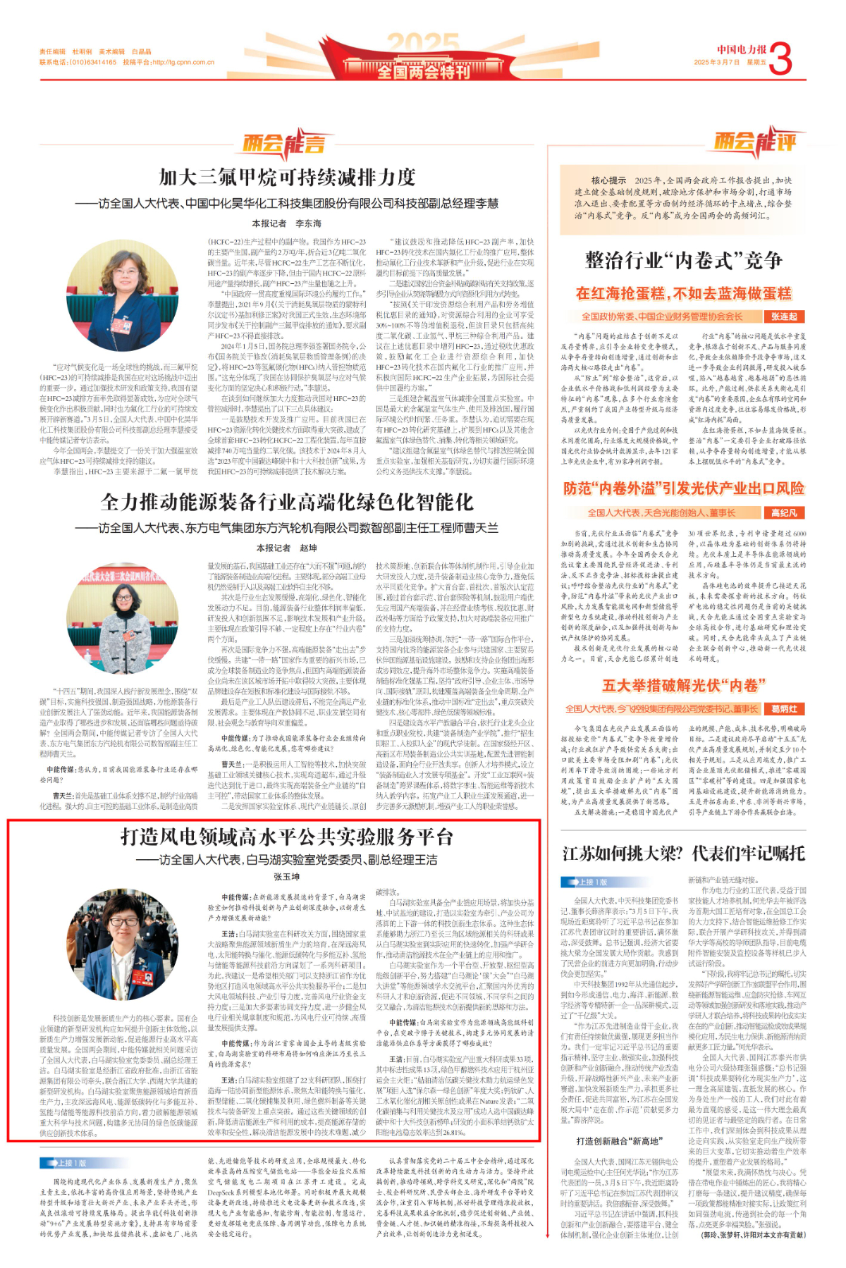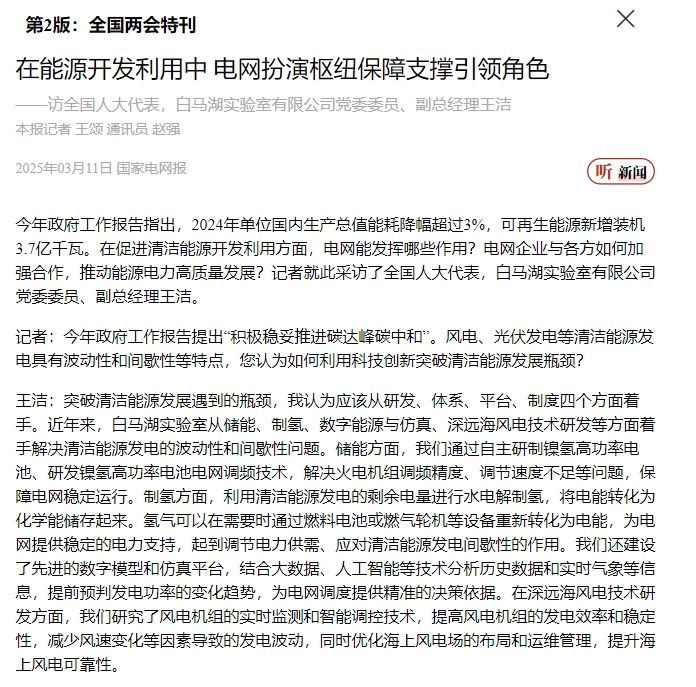 《中国电力报》报道《全国人大代表王洁:打造风电领域高水平公共实验服务平台》。 中国电力报 图