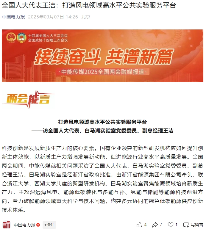 《中国电力报》微信公众号报道《全国人大代表王洁:打造风电领域高水平公共实验服务平台》。 中国电力报微信公众号 图