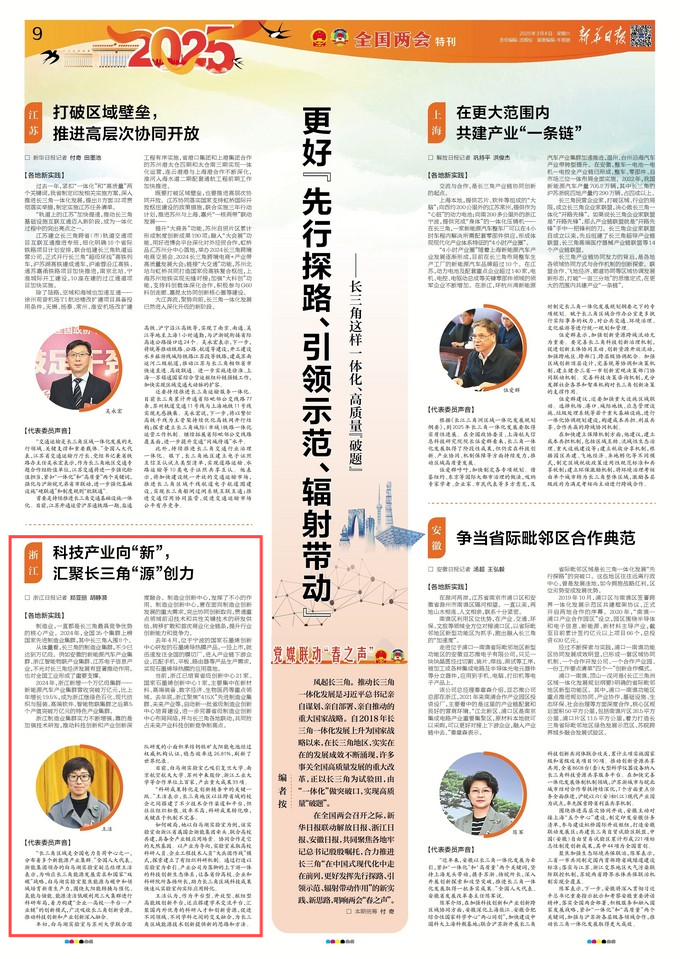 江苏省委机关报《新华日报》全国两会特刊长三角一体化相关主题稿聚焦全国人大代表、爱情岛论坛 王洁同志。 新华日报 图