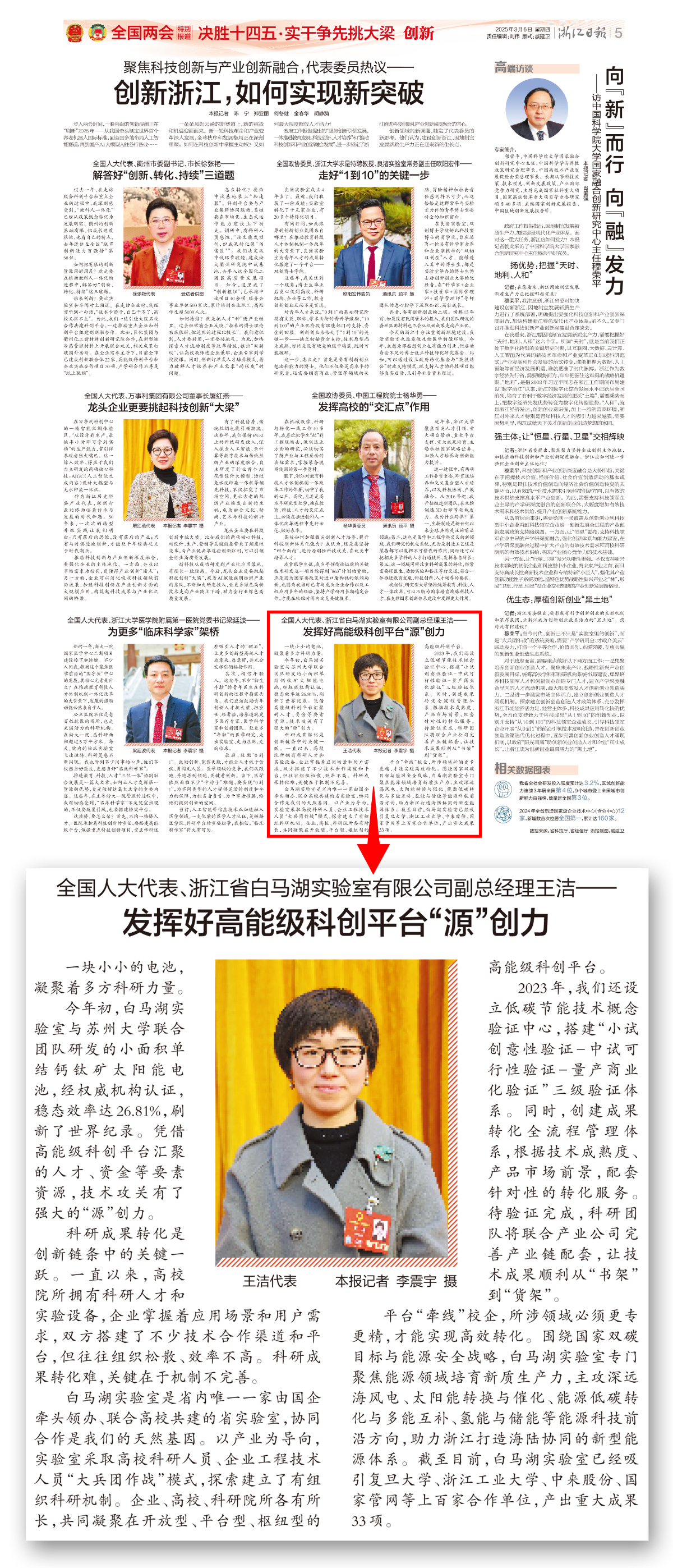 《浙江日报》全国两会特别报道《全国人大代表、浙江省白马湖实验室有限公司副总经理王洁——发挥好高能级科创平台“源”创力》。 浙江日报 图