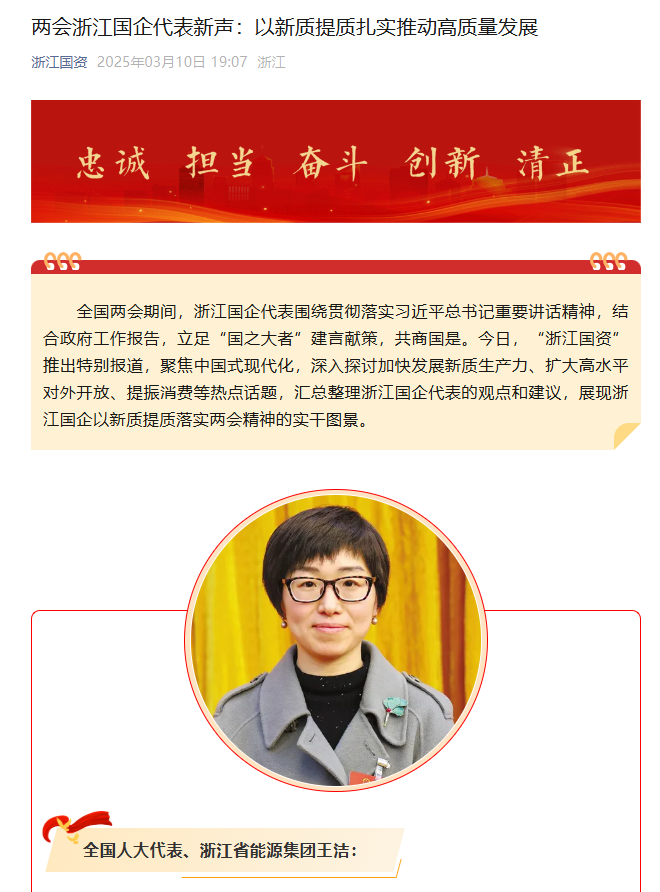 “浙江国资”微信公众号报道《两会浙江国企代表新声:以新质提质扎实推动高质量发展》。 浙江国资 图
