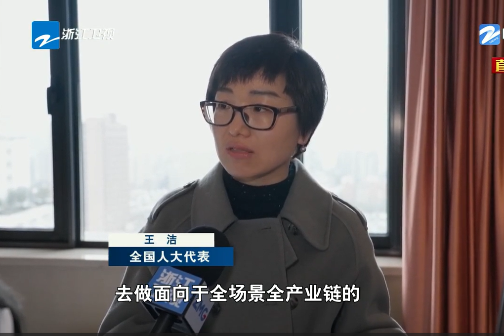 浙江卫视《浙江新闻联播》报道《直通全国两会 出席十四届全国人大三次会议的浙江代表团抵京》,采访王洁同志。 浙江卫视《浙江新闻联播》 图