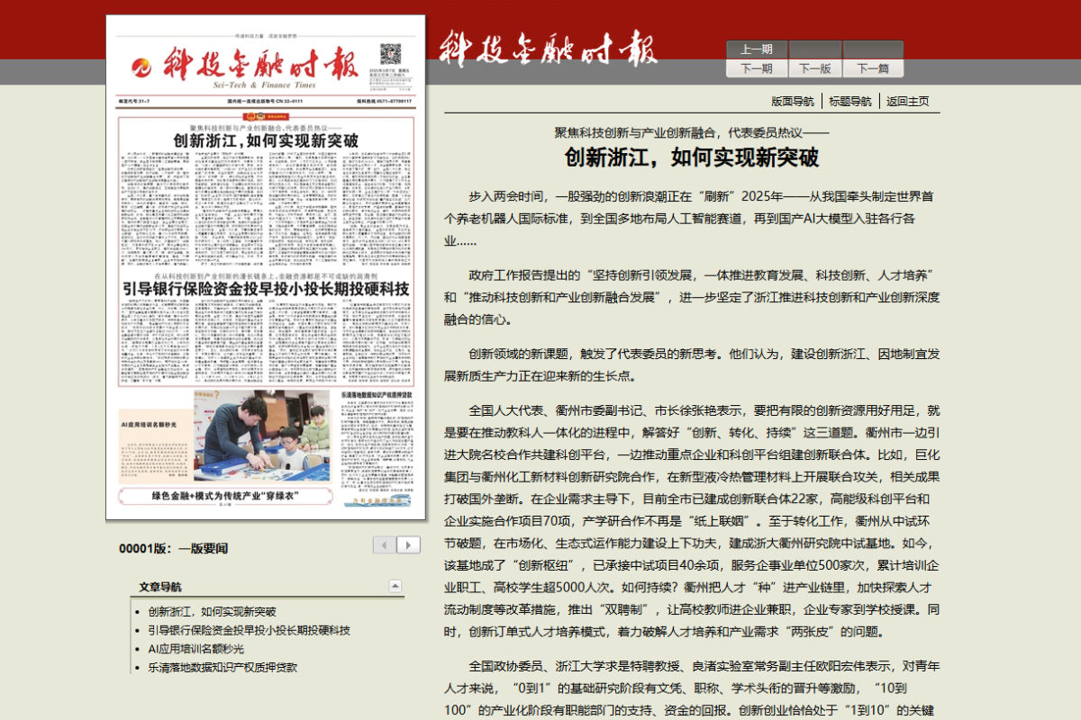 《科技金融时报》报道《聚焦科技创新与产业创新融合,代表委员热议——创新浙江,如何实现新突破》。 科技金融时报 图