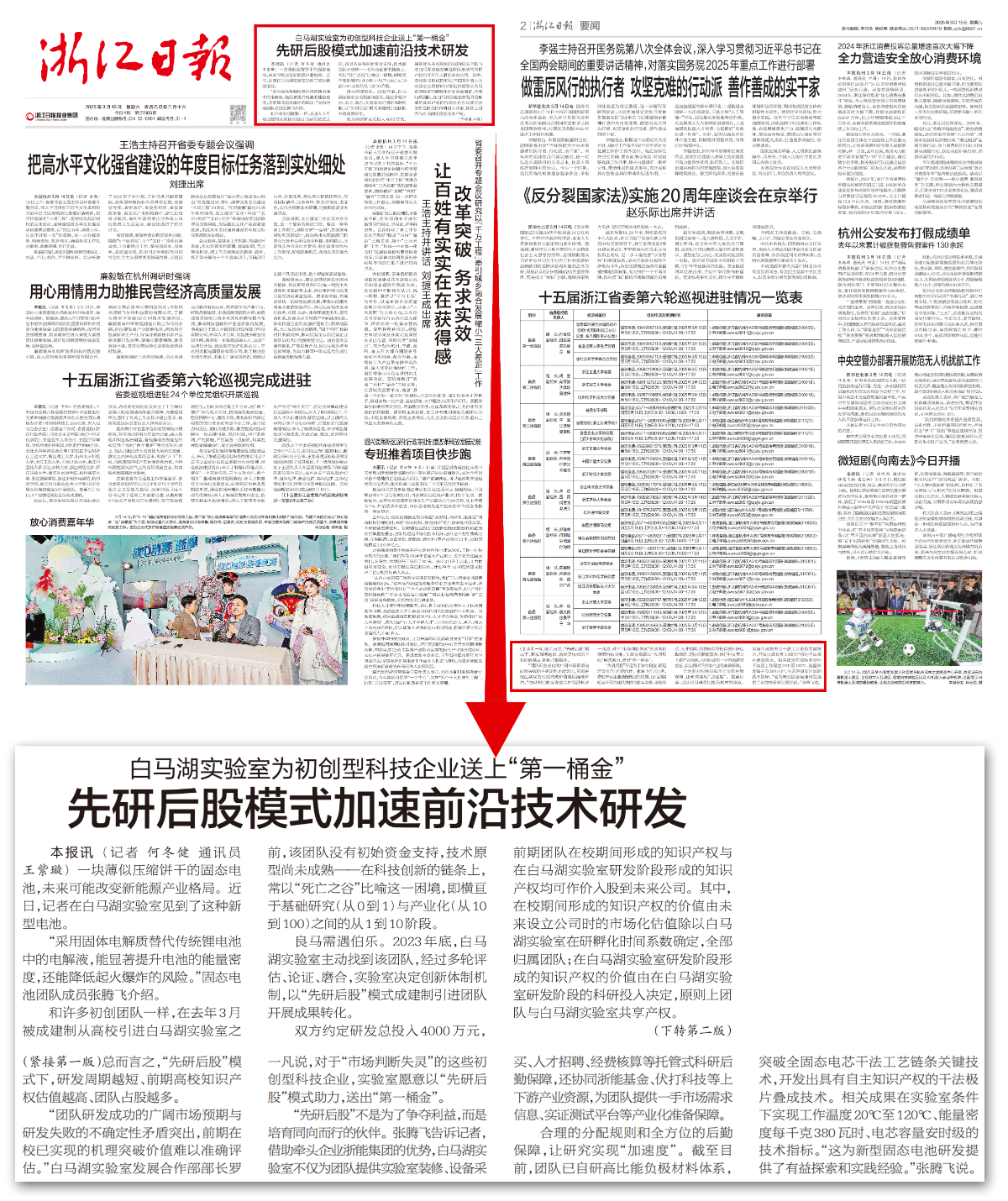 《浙江日报》3月15日头版报眼报道白马湖实验室为初创型科技企业送上“第一桶金”,先研后股模式加速前沿技术研发。