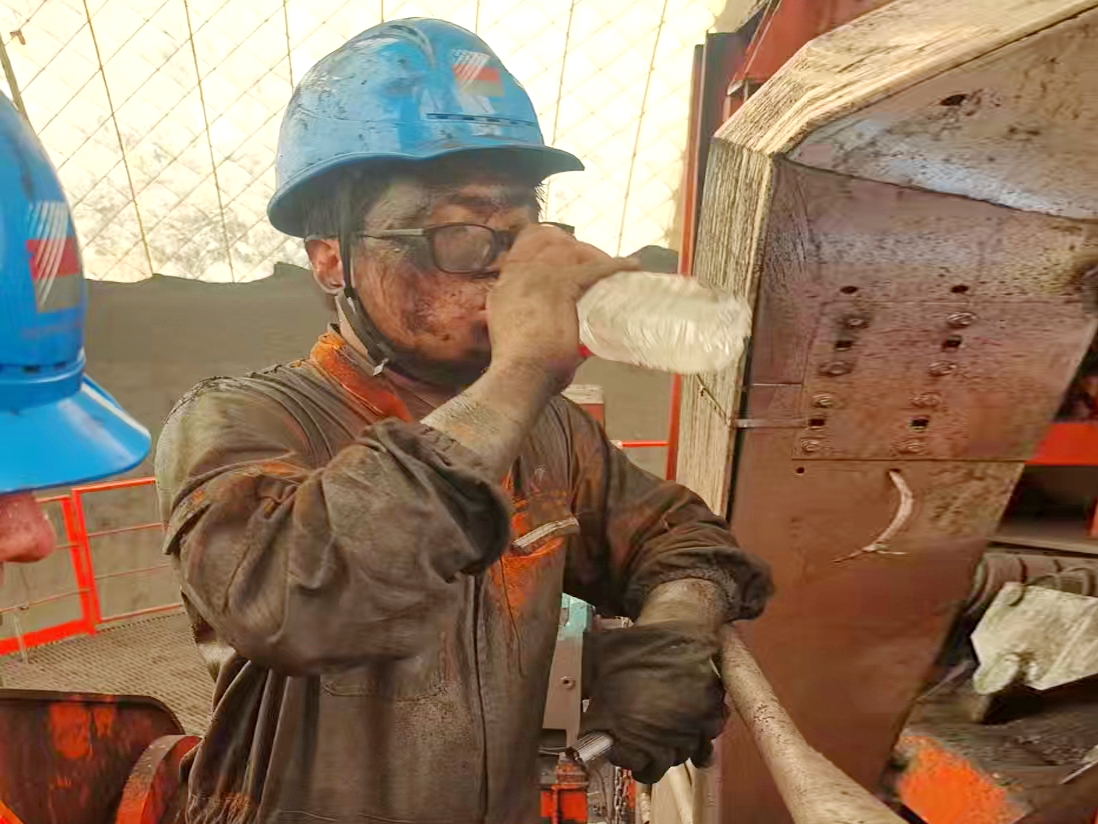 满身煤泥的检修人员正在检修间隙补充水分。 潘黎明 摄