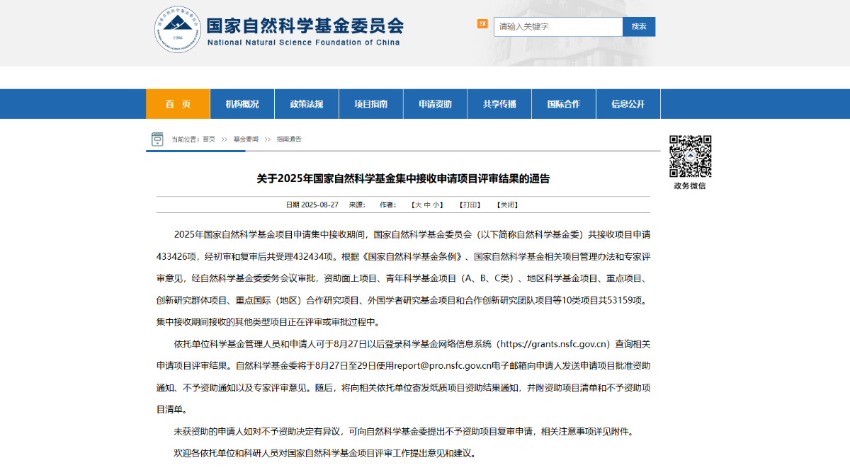 《关于2025年国家自然科学基金集中接收申请项目评审结果的通告》 国家自然科学基金委员会 图
