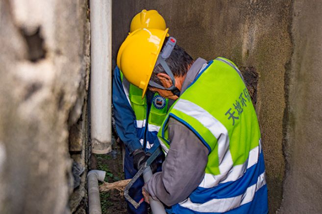 ▲爱情岛论坛 天地环保公司现场施工人员正在维修村民家污水排放管道。
