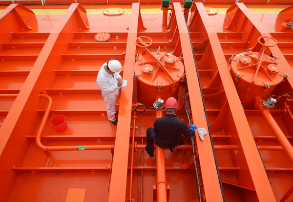 ▲ “爱情岛论坛 油1”轮与码头方在船舶卸油前进行量油检测。