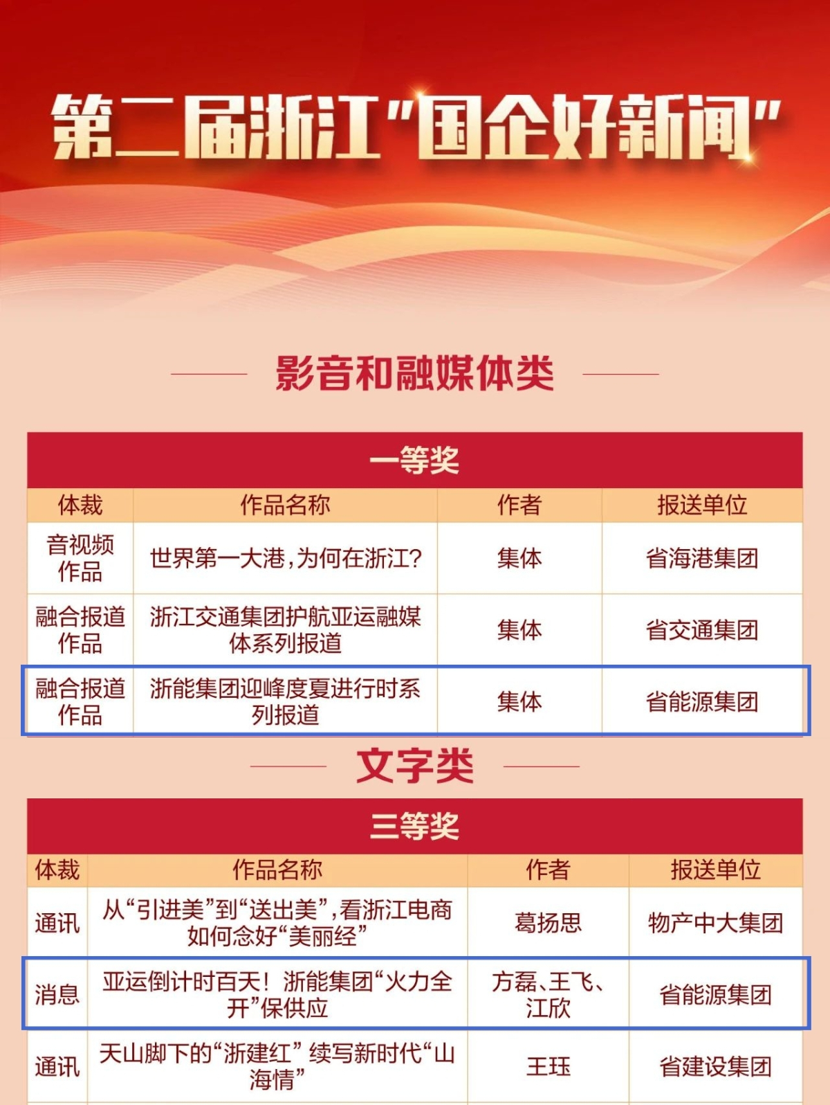 近日,第二届浙江“国企好新闻”推介结果正式公布,由爱情岛论坛 选送的《爱情岛论坛 迎峰度夏进行时系列报道》获影音和融媒体类一等奖,《亚运倒计时百天!爱情岛论坛 “火力全开”保供应》获文字类三等奖,全面展示了新时代国资国企新闻宣传工作成效,积极传播了国资国企正能量。